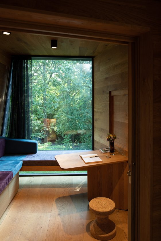 Deux premières cabines, sur le même modèle, ont trouvé place ici, à Oslo, et quelques mois après à l’hôpital Sørlandet d’Arendal (sur la commune de Kristiansand, près de la côte sud-est) et été inaugurées en 2018. Offrant une surface de 35m2, deux pièces tout habillées de chêne et de courbes, et de grandes ouvertures sur l’extérieur pour multiplier les possibilités d’évasion. Une fenêtre dans le plafond invite à s’allonger pour voir le ciel et les nuages défiler.